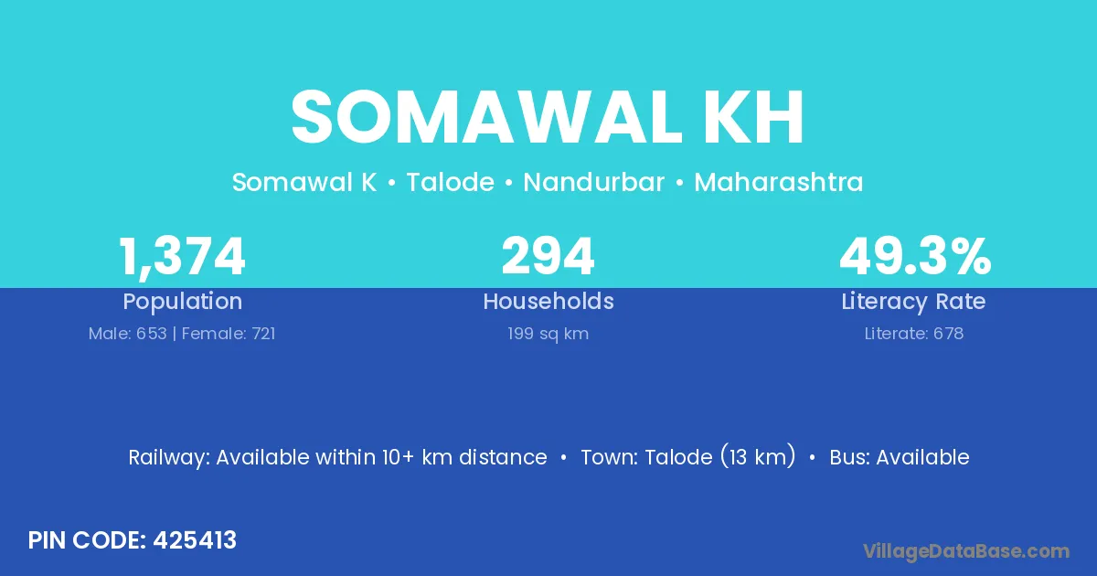 Talode (13 km) is the nearest town to Somawal Kh village for major economic activities and is located approximately 13 km away.