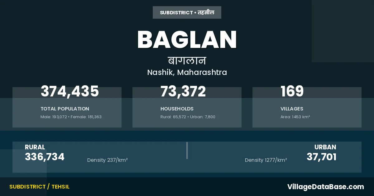 According to the 2011 census The total area of Baglan Tehsil is 1453 km², with a population of 374435 people. The population density is 258 inhabitants per square kilometre, and there are approximately 73372 houses in the sub district.