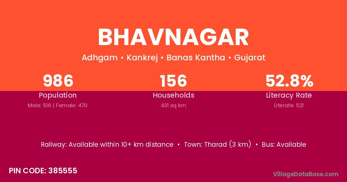 The literacy rate of Bhavnagar village is 59.55%. Male literacy stands at 70.02% and female literacy at 48.02%.