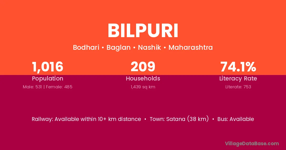Satana (38 km) is the nearest town to Bilpuri village for major economic activities and is located approximately 38 km away.