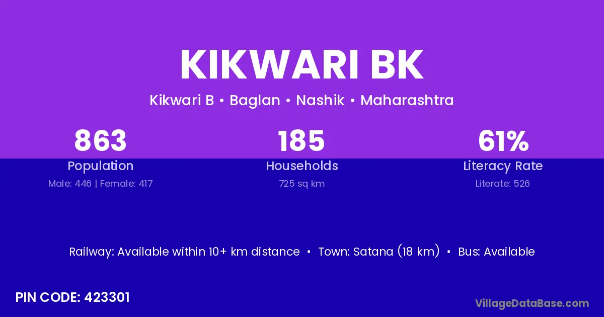 Satana (18 km) is the nearest town to Kikwari Bk village for major economic activities and is located approximately 18 km away.