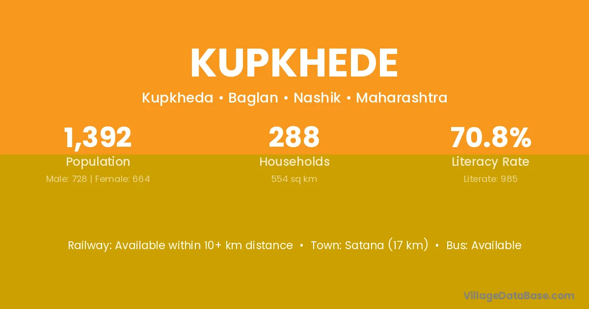 Satana (17 km) is the nearest town to Kupkhede village for major economic activities and is located approximately 17 km away.