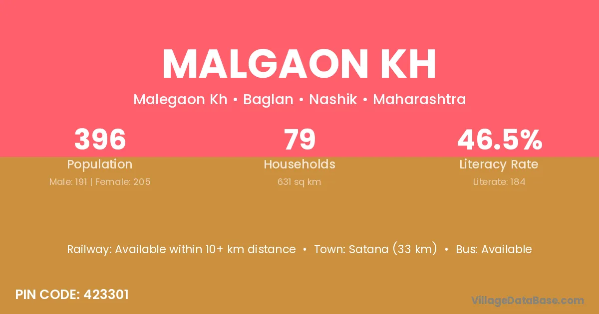 Satana (33 km) is the nearest town to Malgaon Kh village for major economic activities and is located approximately 33 km away.