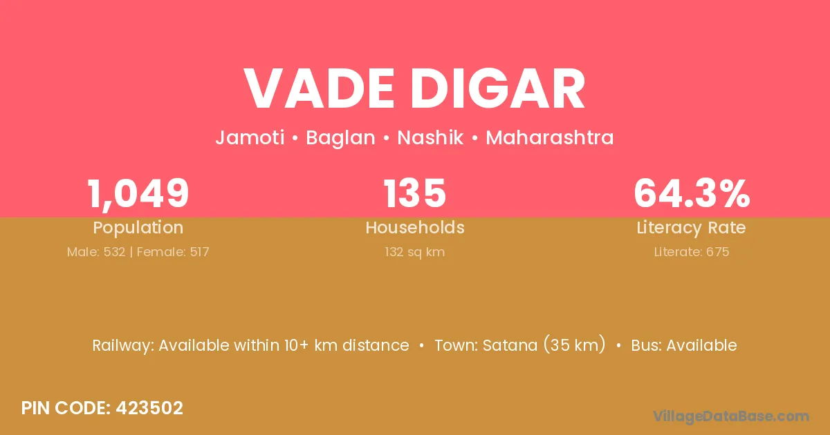 Satana (35 km) is the nearest town to Vade Digar village for major economic activities and is located approximately 35 km away.