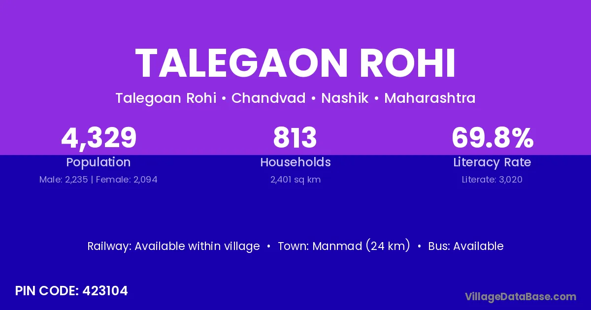 Manmad (24 km) is the nearest town to Talegaon Rohi village for major economic activities and is located approximately 24 km away.