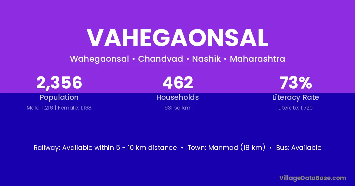 Manmad (18 km) is the nearest town to Vahegaonsal village for major economic activities and is located approximately 18 km away.