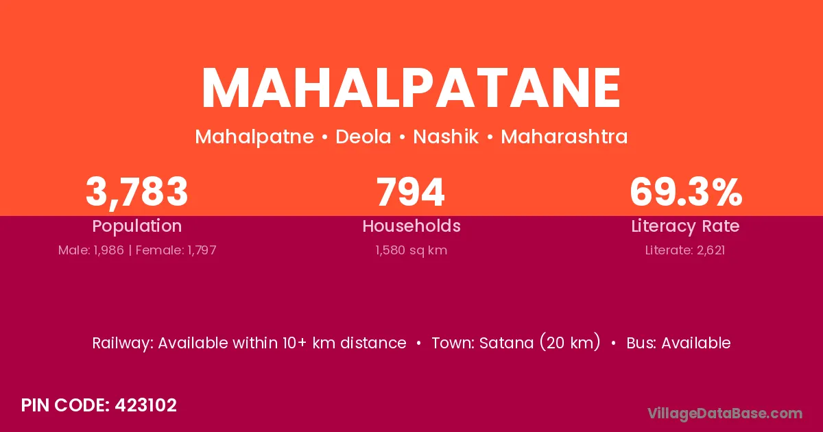 Satana (20 km) is the nearest town to Mahalpatane village for major economic activities and is located approximately 20 km away.