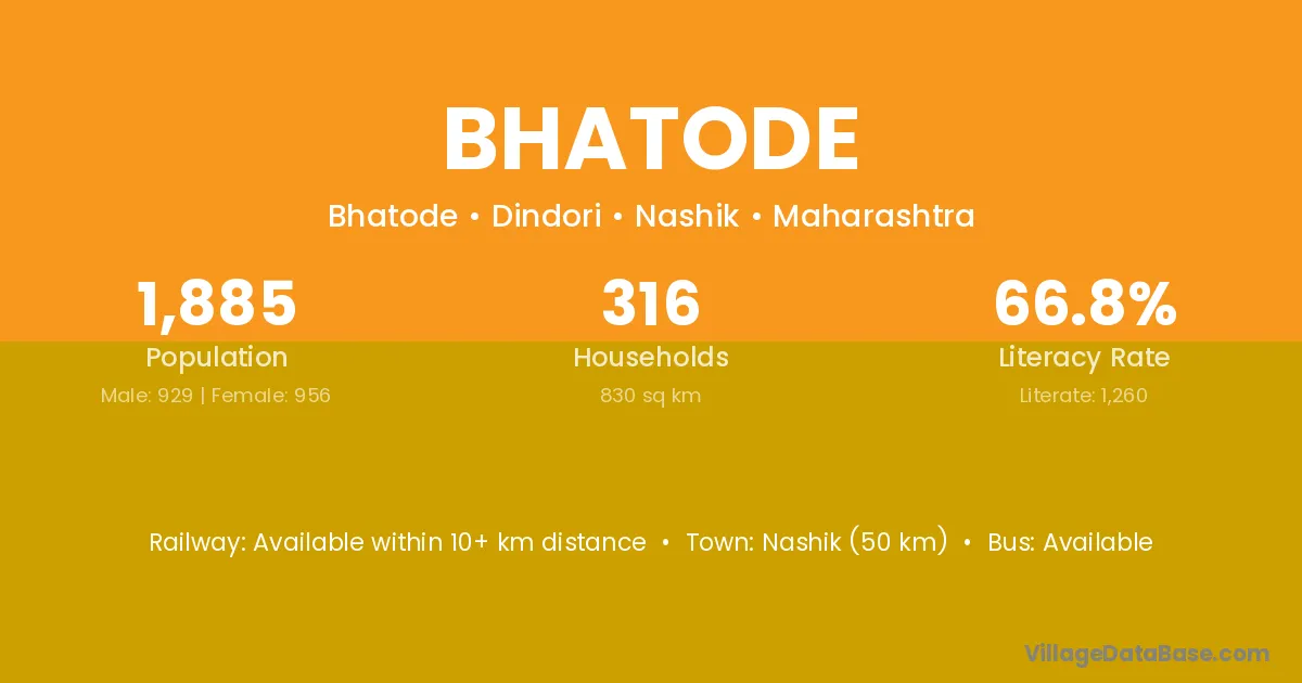 Nashik (50 km) is the nearest town to Bhatode village for major economic activities and is located approximately 50 km away.