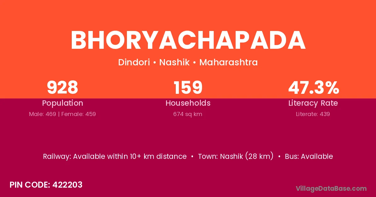Nashik (28 km) is the nearest town to Bhoryachapada village for major economic activities and is located approximately 28 km away.