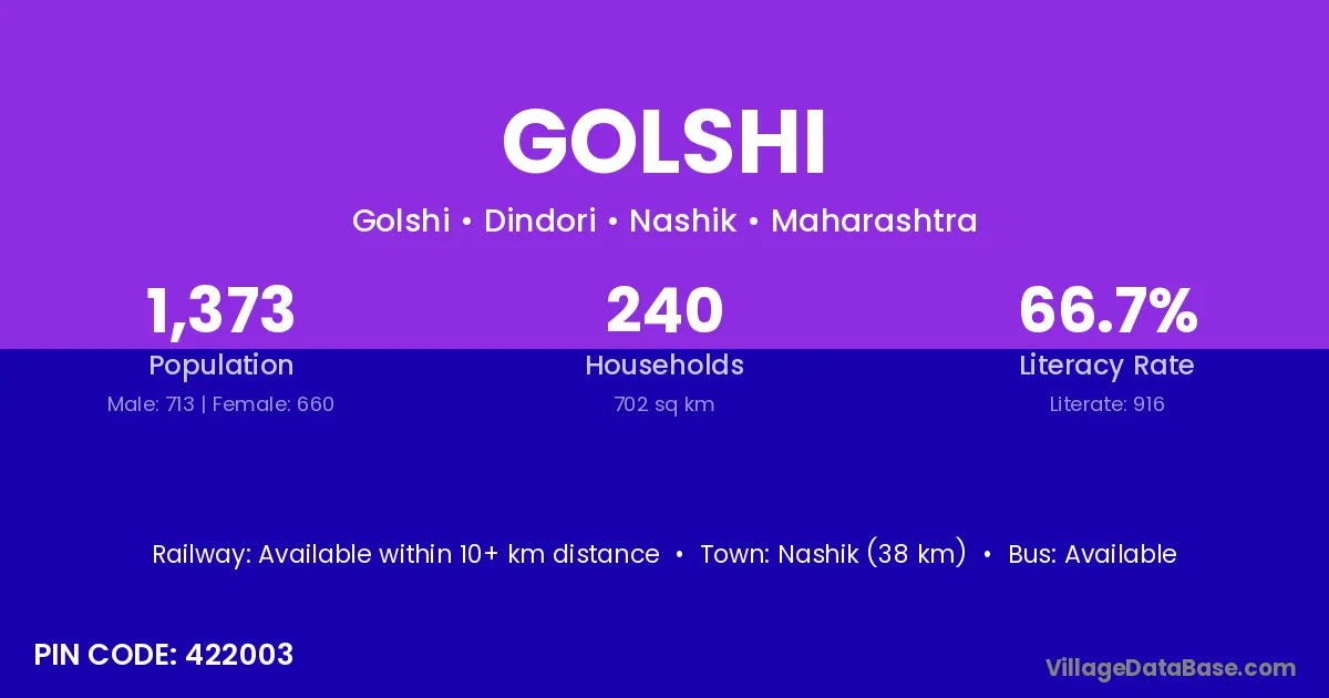 Nashik (38 km) is the nearest town to Golshi village for major economic activities and is located approximately 38 km away.