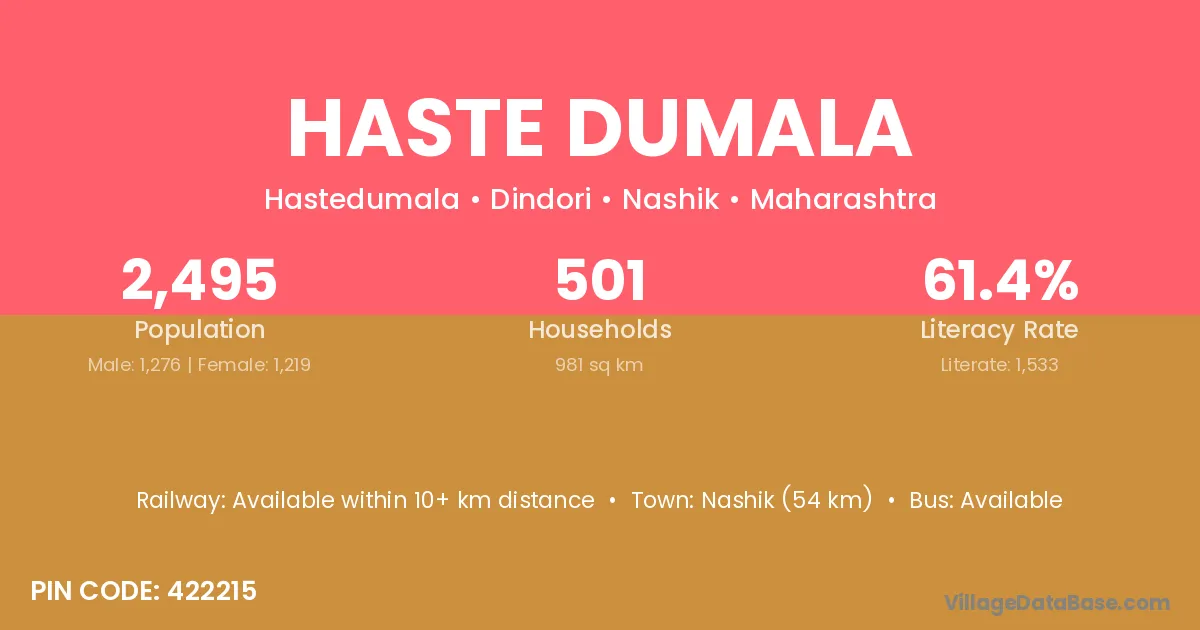 Nashik (54 km) is the nearest town to Haste Dumala village for major economic activities and is located approximately 54 km away.