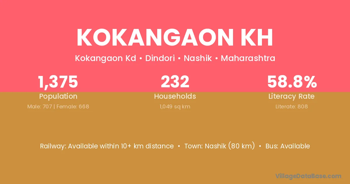 Nashik (80 km) is the nearest town to Kokangaon Kh village for major economic activities and is located approximately 80 km away.