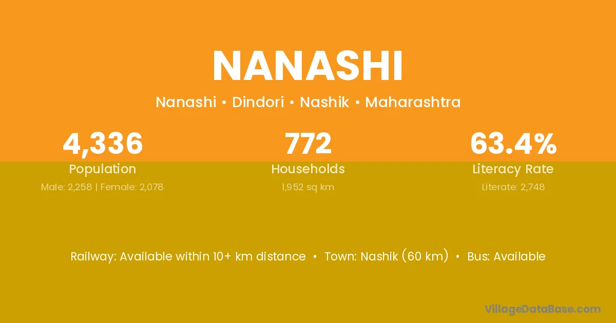 Nashik (60 km) is the nearest town to Nanashi village for major economic activities and is located approximately 60 km away.