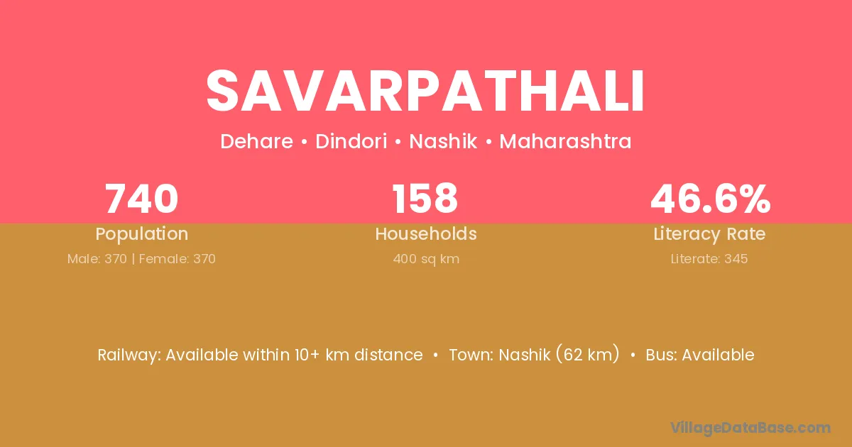 Nashik (62 km) is the nearest town to Savarpathali village for major economic activities and is located approximately 62 km away.