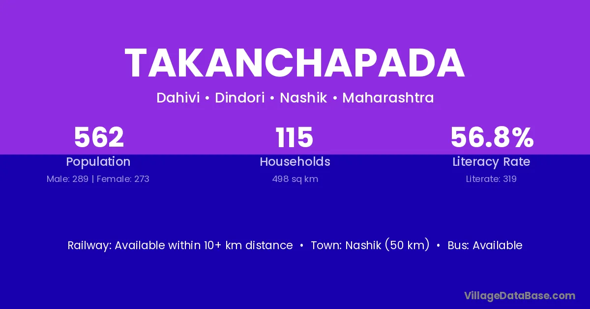 Nashik (50 km) is the nearest town to Takanchapada village for major economic activities and is located approximately 50 km away.