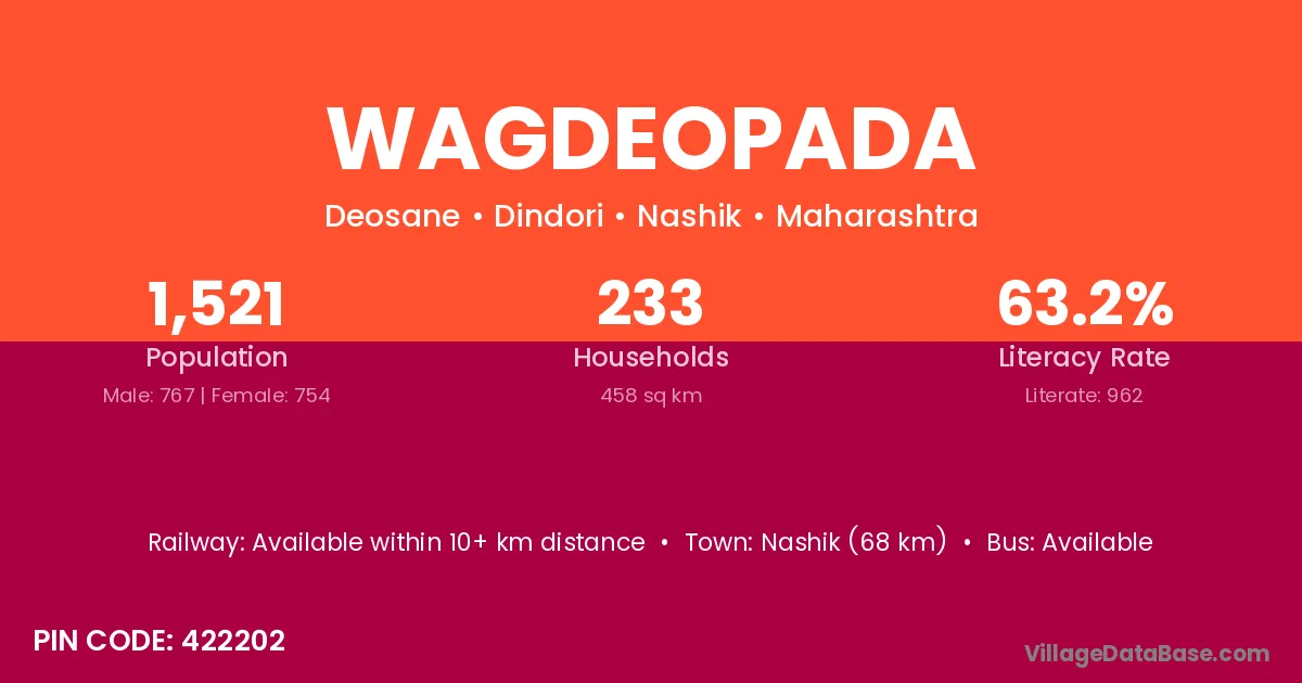 Nashik (68 km) is the nearest town to Wagdeopada village for major economic activities and is located approximately 68 km away.