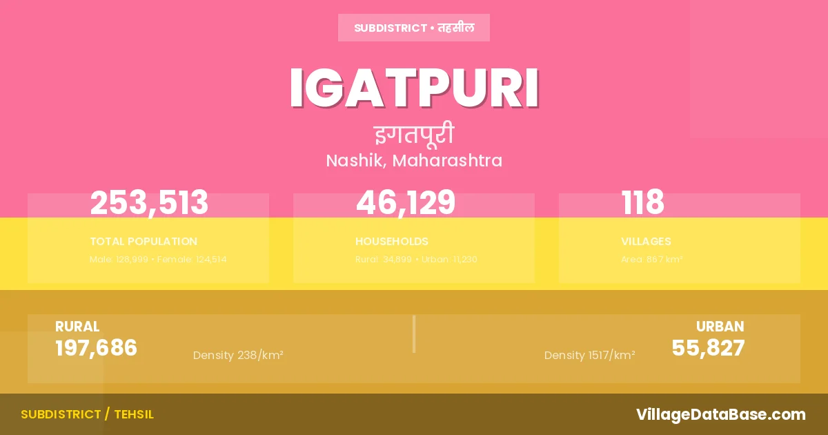 According to the 2011 census The total area of Igatpuri Tehsil is 867 km², with a population of 253513 people. The population density is 292 inhabitants per square kilometre, and there are approximately 46129 houses in the sub district.