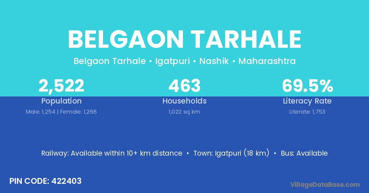 Igatpuri (18 km) is the nearest town to Belgaon Tarhale village for major economic activities and is located approximately 18 km away.