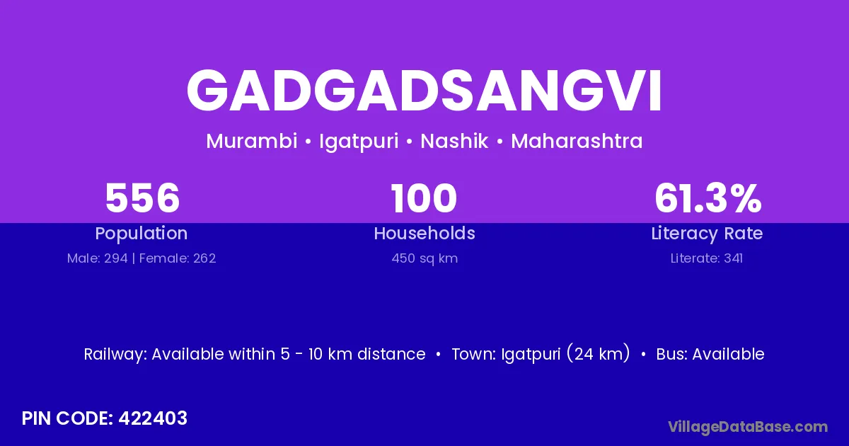 Igatpuri (24 km) is the nearest town to Gadgadsangvi village for major economic activities and is located approximately 24 km away.