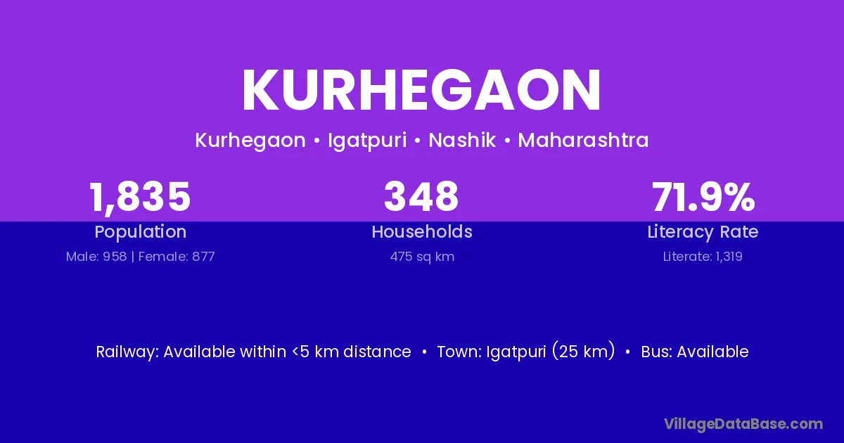 Igatpuri (25 km) is the nearest town to Kurhegaon village for major economic activities and is located approximately 25 km away.
