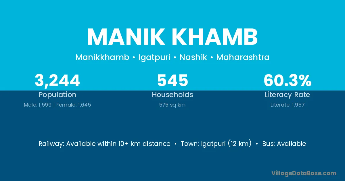 Igatpuri (12 km) is the nearest town to Manik Khamb village for major economic activities and is located approximately 12 km away.