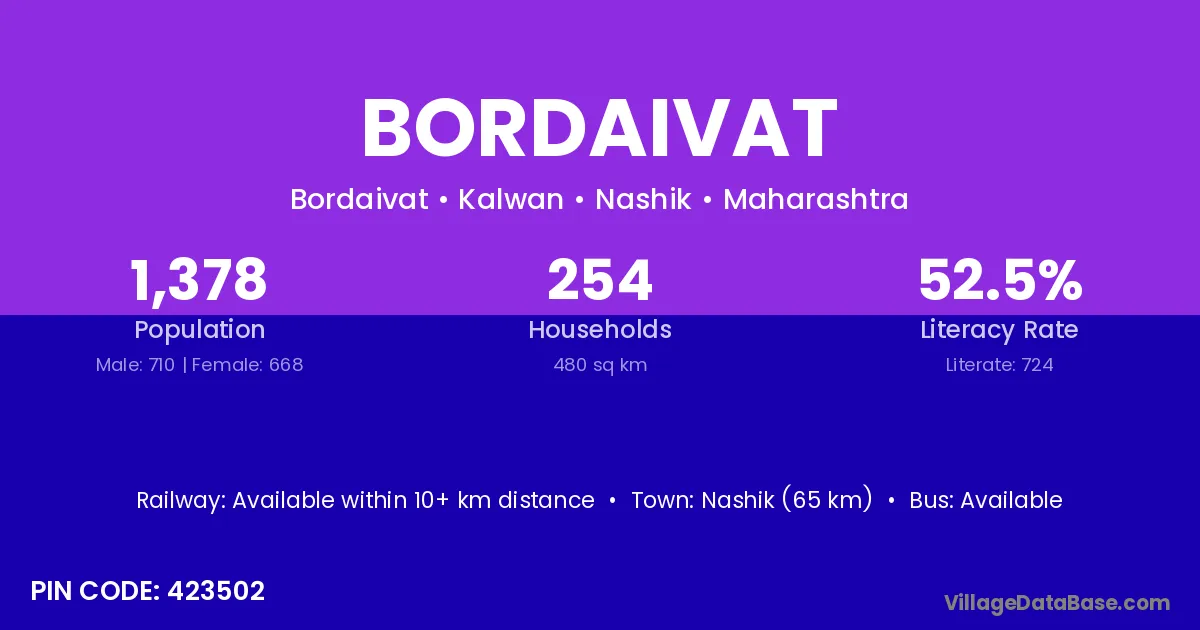 Nashik (65 km) is the nearest town to Bordaivat village for major economic activities and is located approximately 65 km away.