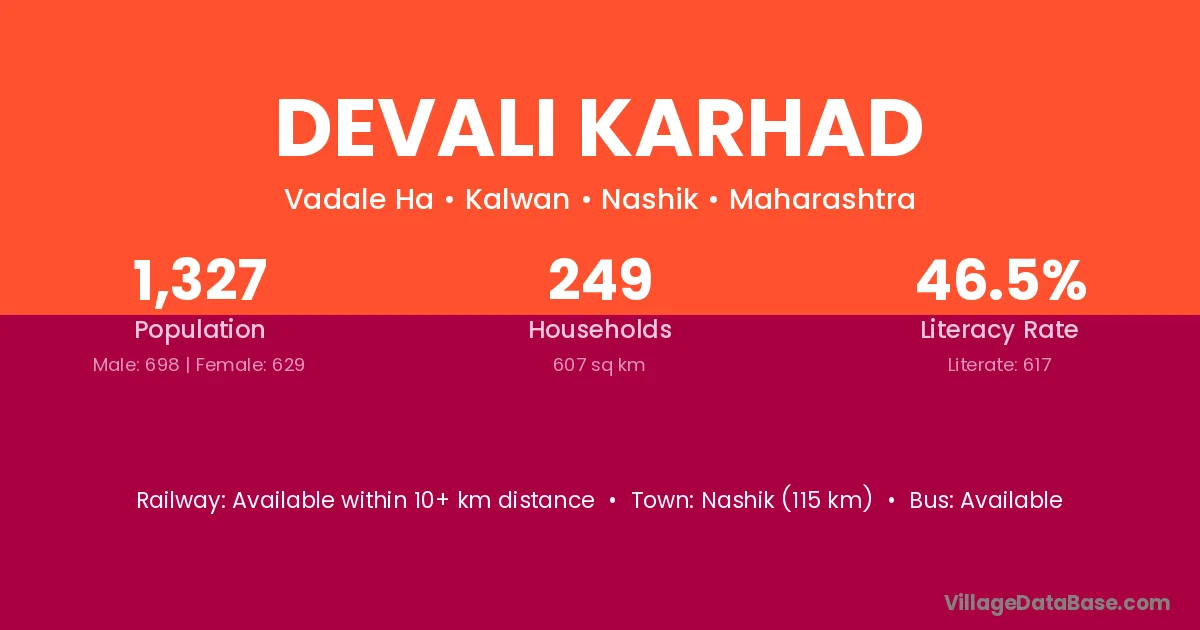 Nashik (115 km) is the nearest town to Devali Karhad village for major economic activities and is located approximately 115 km away.