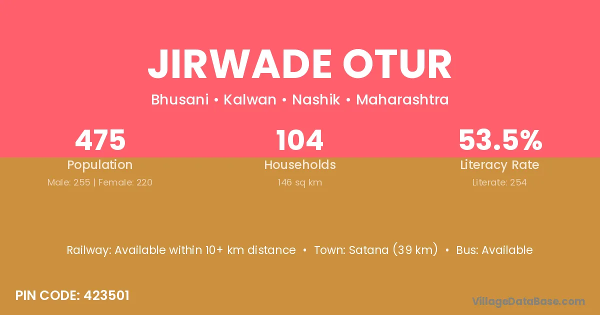 Satana (39 km) is the nearest town to Jirwade Otur village for major economic activities and is located approximately 39 km away.
