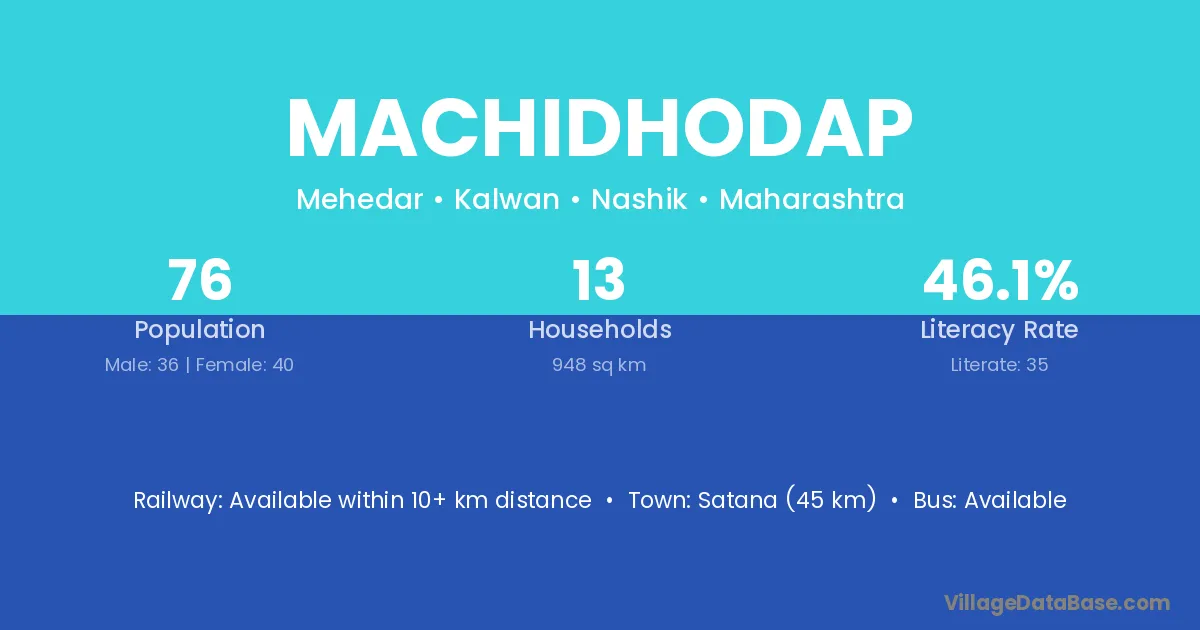 Satana (45 km) is the nearest town to Machidhodap village for major economic activities and is located approximately 45 km away.