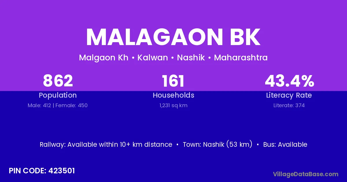 Malagaon Bk village has a total population of 862 people, of which 412 are males and 450 are females.