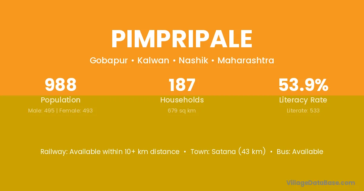 Satana (43 km) is the nearest town to Pimpripale village for major economic activities and is located approximately 43 km away.