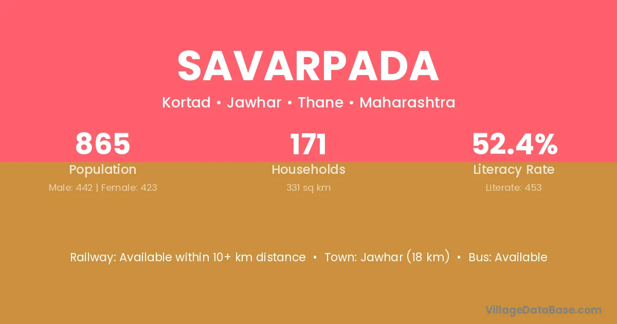 Satana (55 km) is the nearest town to Savarpada village for major economic activities and is located approximately 55 km away.