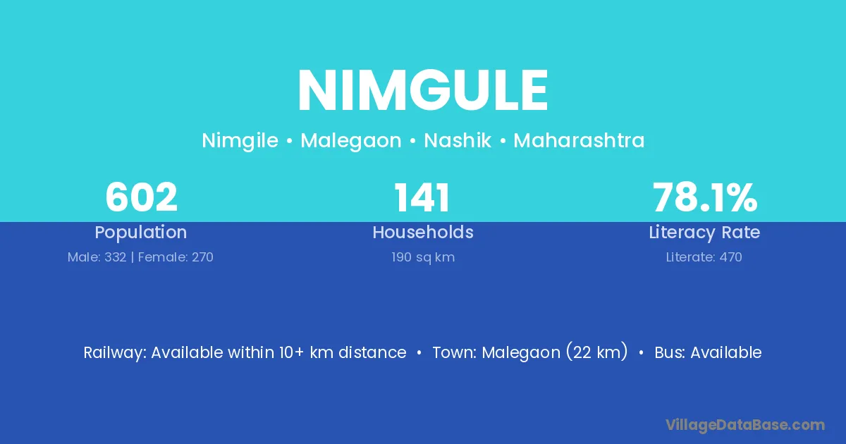 Malegaon (22 km) is the nearest town to Nimgule village for major economic activities and is located approximately 22 km away.