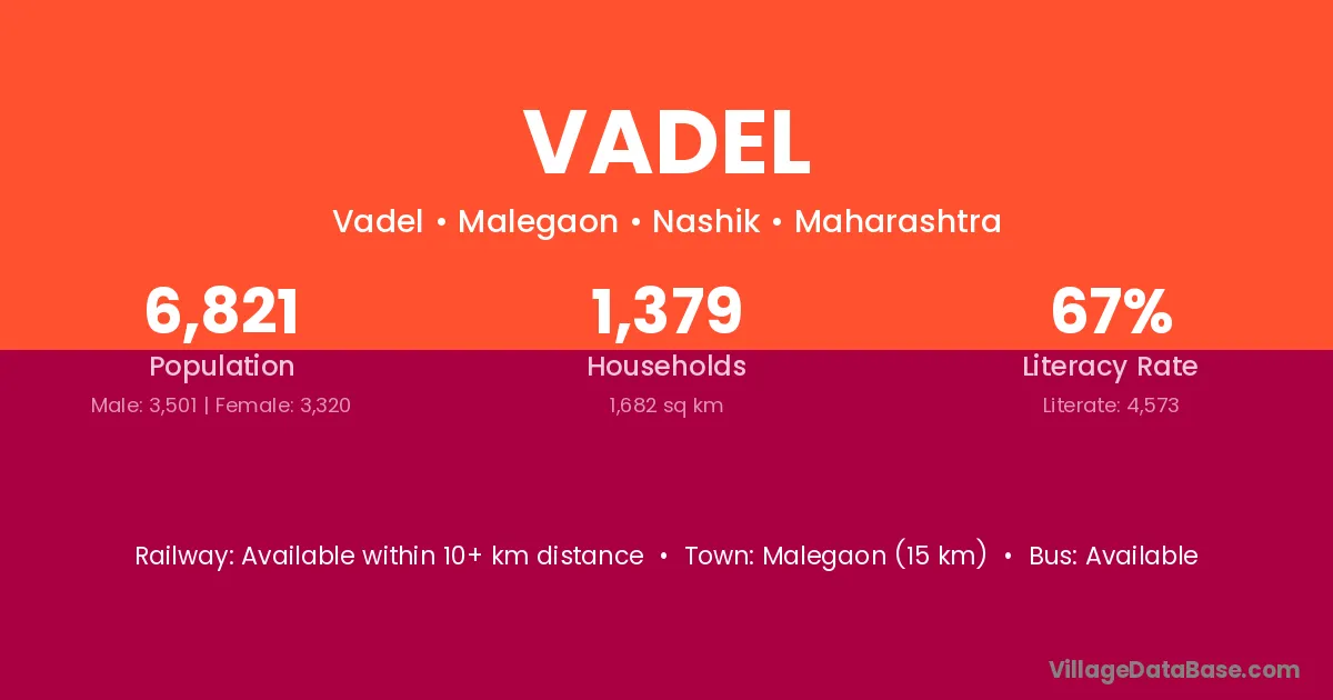 Malegaon (15 km) is the nearest town to Vadel village for major economic activities and is located approximately 15 km away.