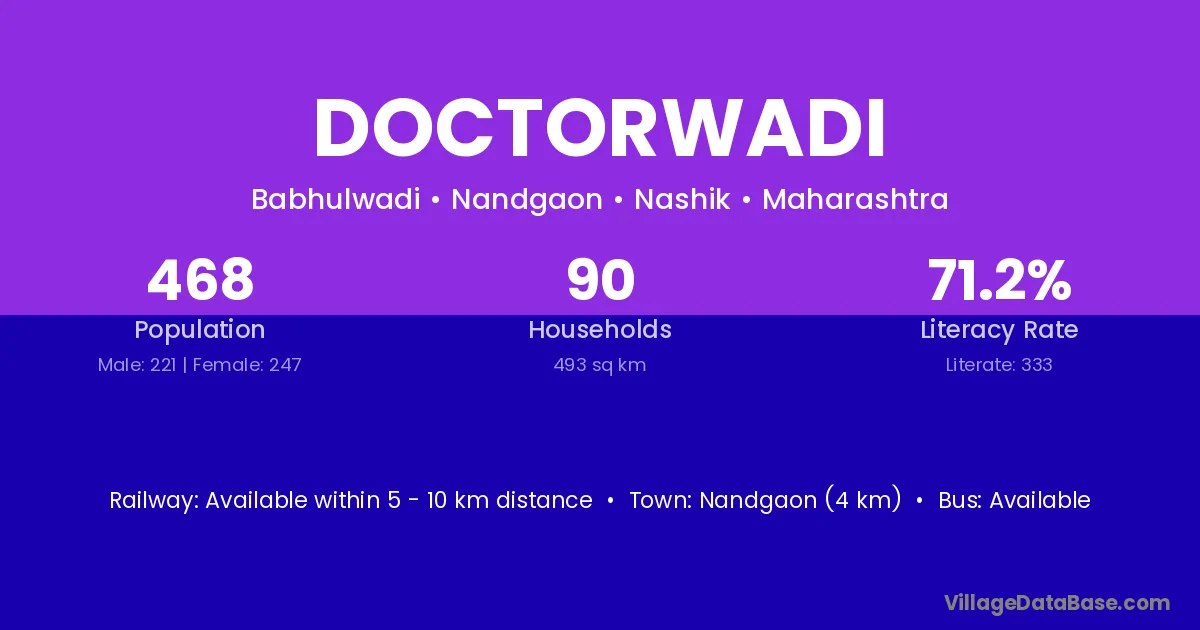 Nandgaon (4 km) is the nearest town to Doctorwadi village for major economic activities and is located approximately 4 km away.