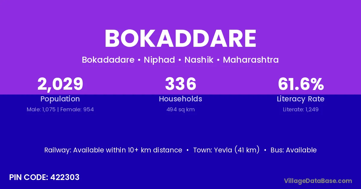 Yevla (41 km) is the nearest town to Bokaddare village for major economic activities and is located approximately 41 km away.