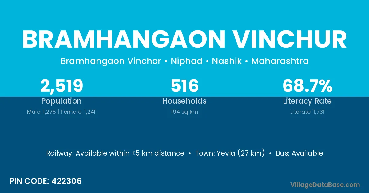 Yevla (27 km) is the nearest town to Bramhangaon Vinchur village for major economic activities and is located approximately 27 km away.