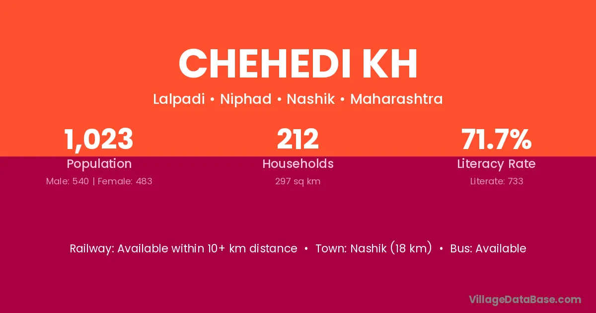Nashik (18 km) is the nearest town to Chehedi Kh village for major economic activities and is located approximately 18 km away.