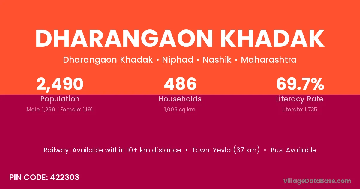 Dharangaon Khadak village has a total population of 2,490 people, of which 1,299 are males and 1,191 are females.