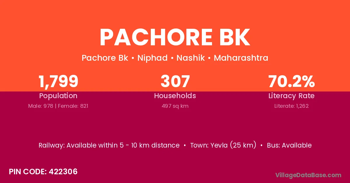 Yevla (25 km) is the nearest town to Pachore Bk village for major economic activities and is located approximately 25 km away.