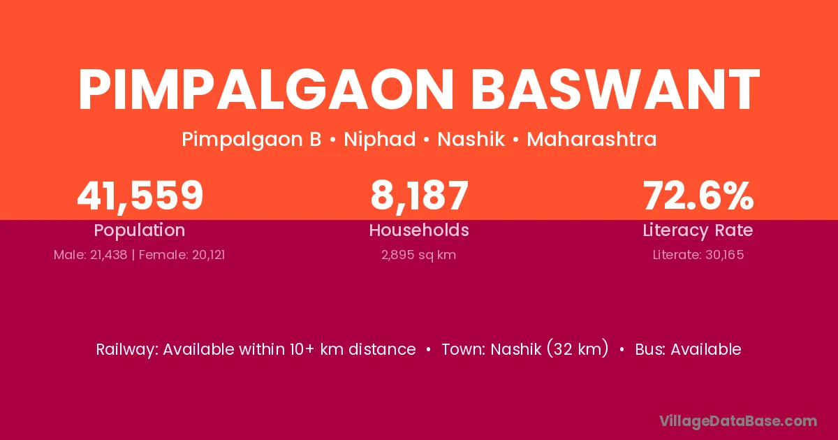 Pimpalgaon Baswant village has a total population of 41,559 people, of which 21,438 are males and 20,121 are females.