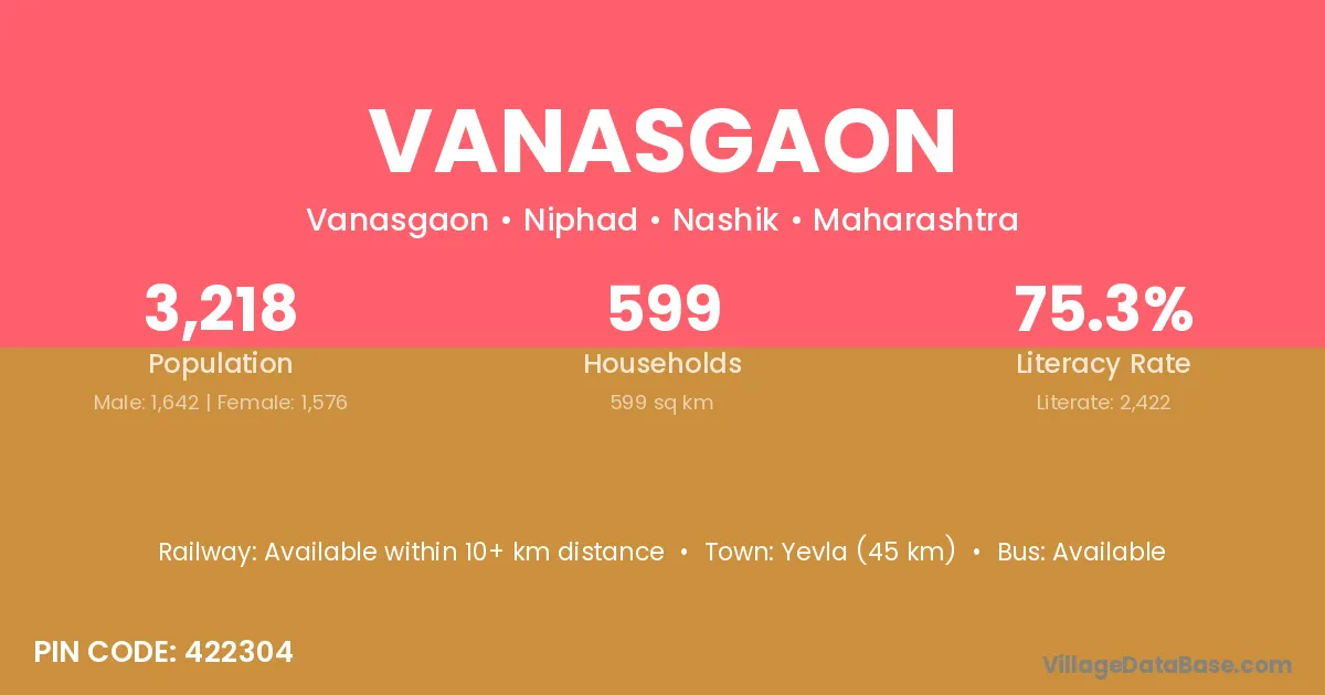 Vanasgaon village has a total population of 3,218 people, of which 1,642 are males and 1,576 are females.