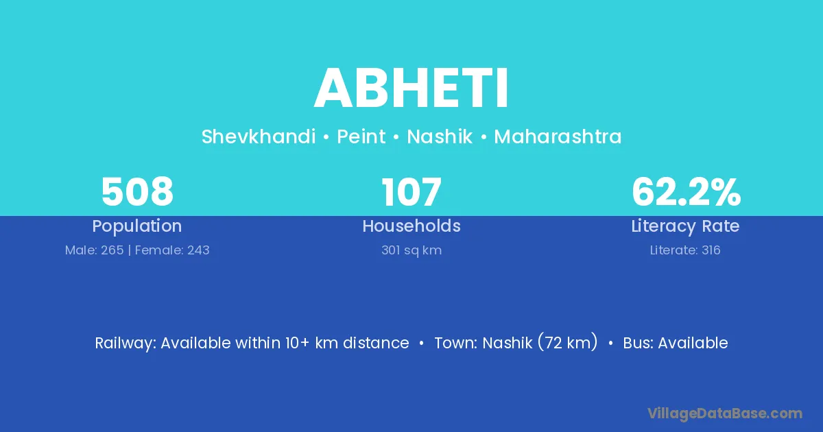 Nashik (72 km) is the nearest town to Abheti village for major economic activities and is located approximately 72 km away.