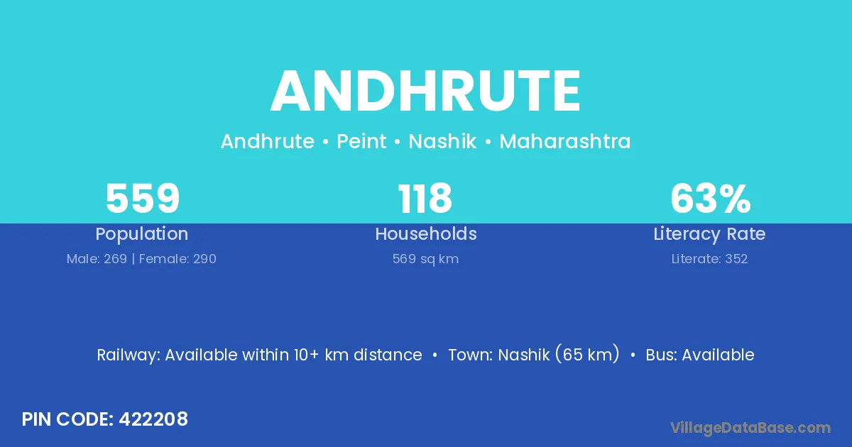 Nashik (65 km) is the nearest town to Andhrute village for major economic activities and is located approximately 65 km away.