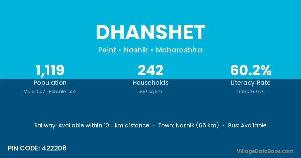 Nashik (65 km) is the nearest town to Dhanshet village for major economic activities and is located approximately 65 km away.
