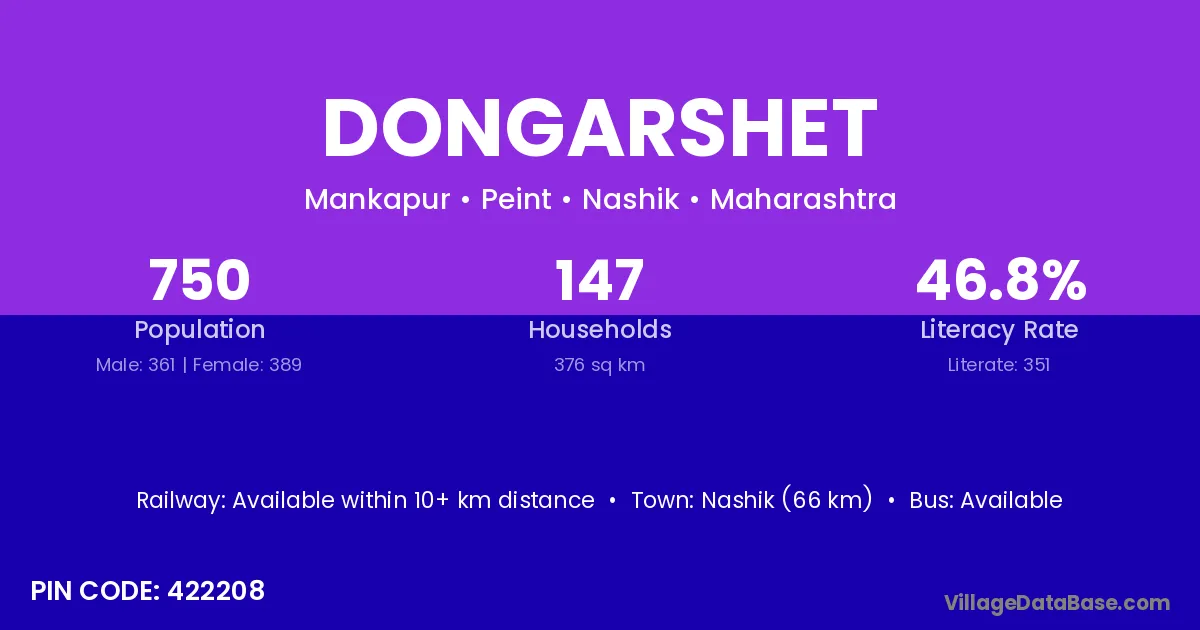 Dongarshet village has a total population of 750 people, of which 361 are males and 389 are females.