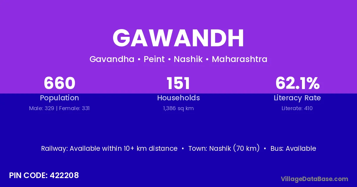 Nashik (70 km) is the nearest town to Gawandh village for major economic activities and is located approximately 70 km away.