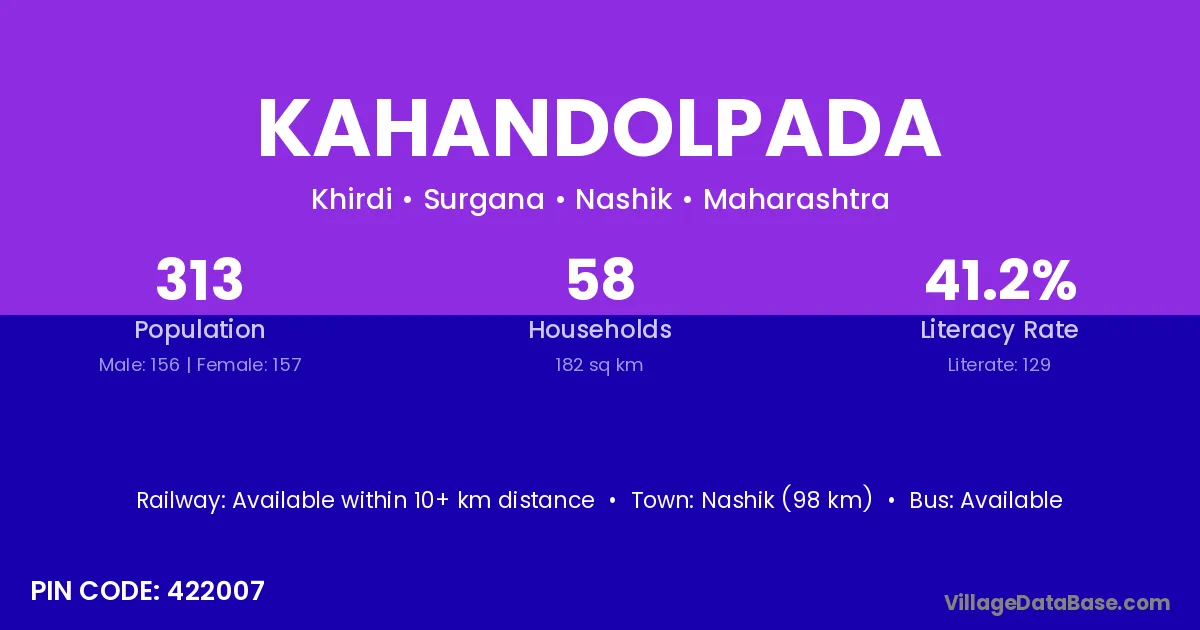 Nashik (65 km) is the nearest town to Kahandolpada village for major economic activities and is located approximately 65 km away.