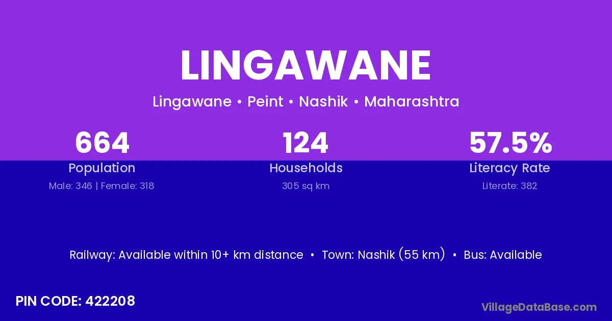 Nashik (55 km) is the nearest town to Lingawane village for major economic activities and is located approximately 55 km away.