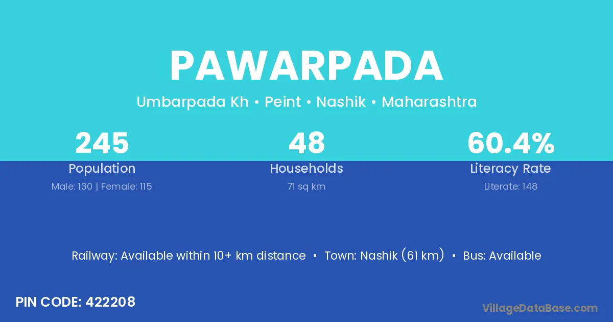 Pawarpada village has a total population of 245 people, of which 130 are males and 115 are females.